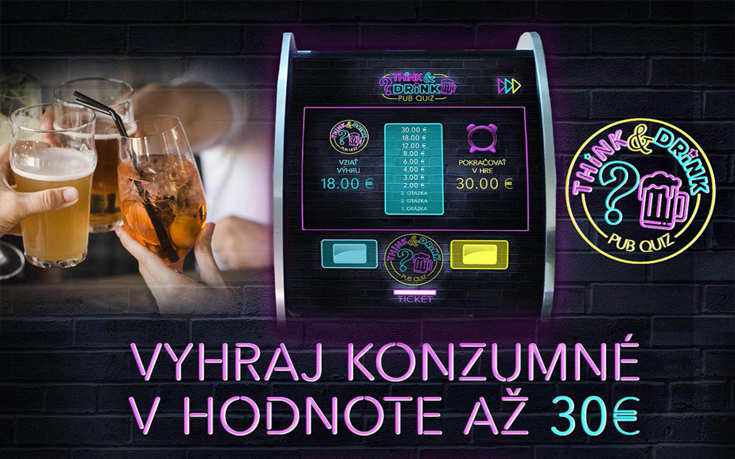 Po správnom zodpovedaní štvrtej otázky môžete hru ukončiť a automat Vám vytlačí tiket v hodnote konzumného až do výšky 30 €. Je len na Vás, či budete riskovať a pokračovať v hre ďalej, alebo si užijete svoju odmenu.